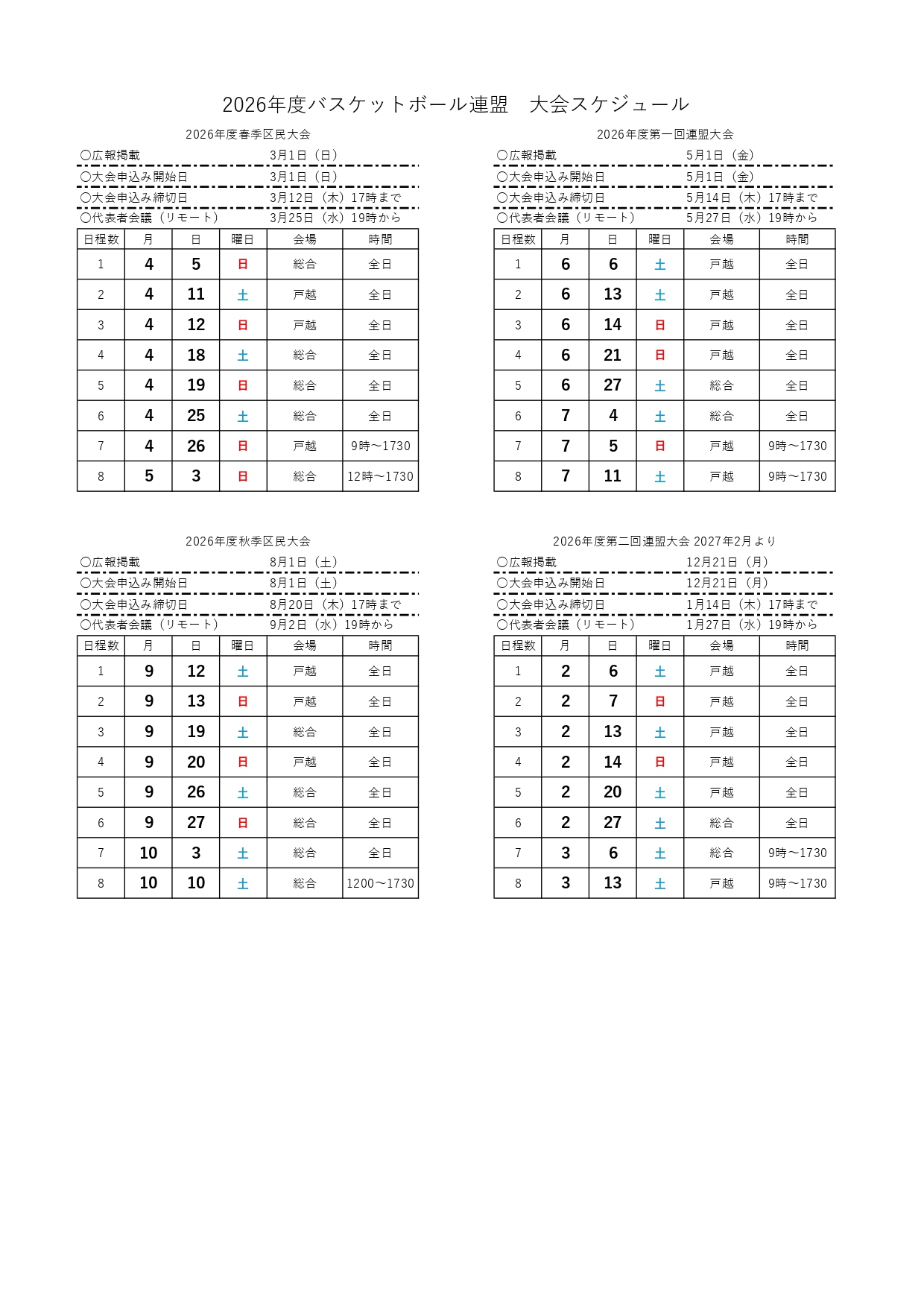 2026年度品川区バスケットボール大会年間スケジュール お知らせ 2026年2月24日お知らせ by 品川バスケ連盟.2026年度品川区バスケットボール大会の年間スケジュールをお知らせいたします。予定となりますので、確定の日程に関しましては大会ごとに当HPでご案内いたします。前の記事